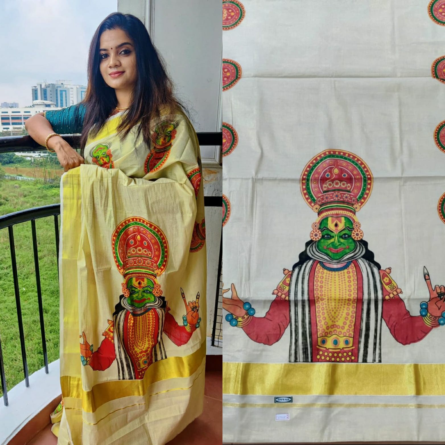 Experience the traditional beauty of Kerala with the Kerala Saree. This beautiful saree features a BIG MURAL KATHAKALI GOLDEN TISSUE design, bringing you timeless elegance and style. Crafted from the finest materials, the Kerala Saree is perfect for special events and occasions.