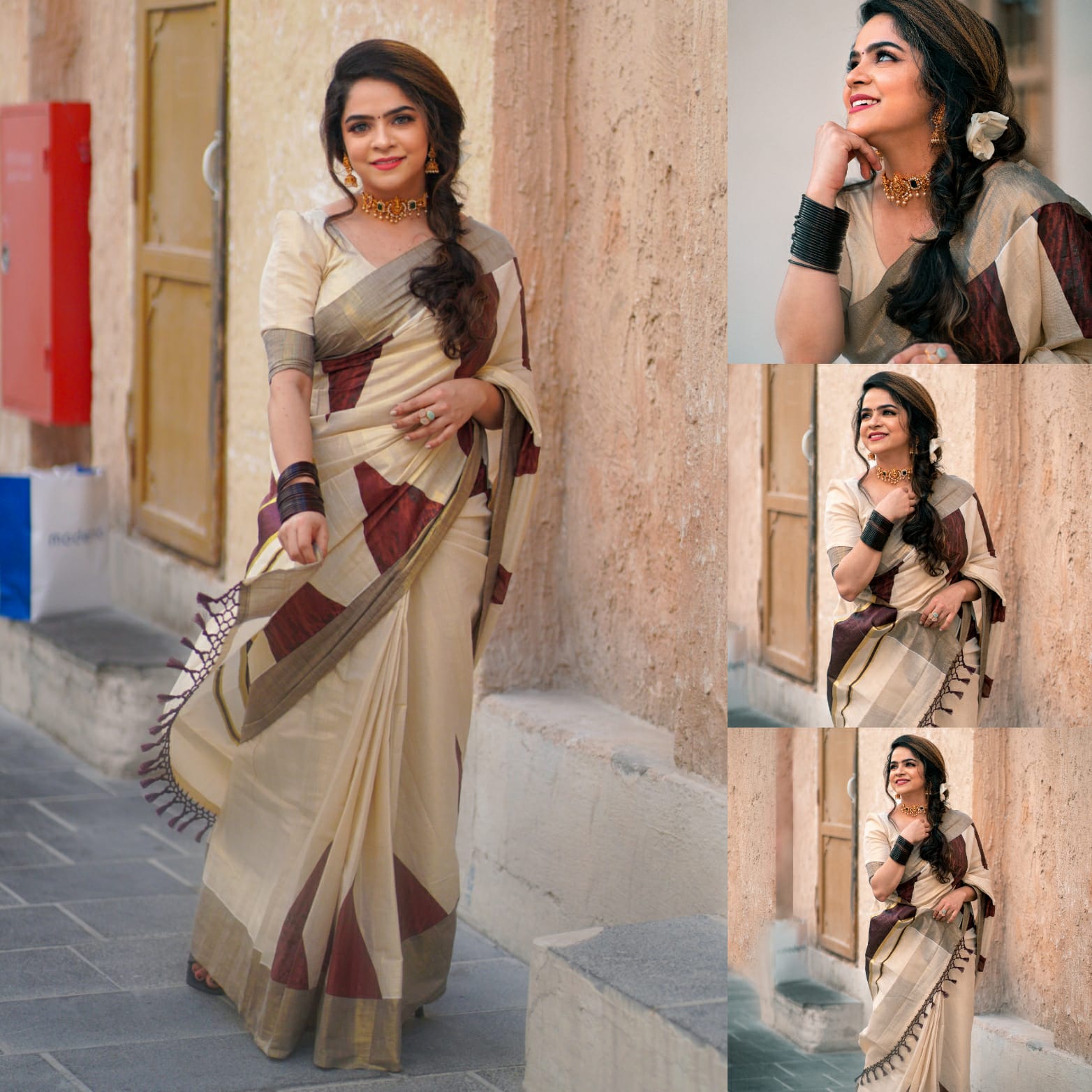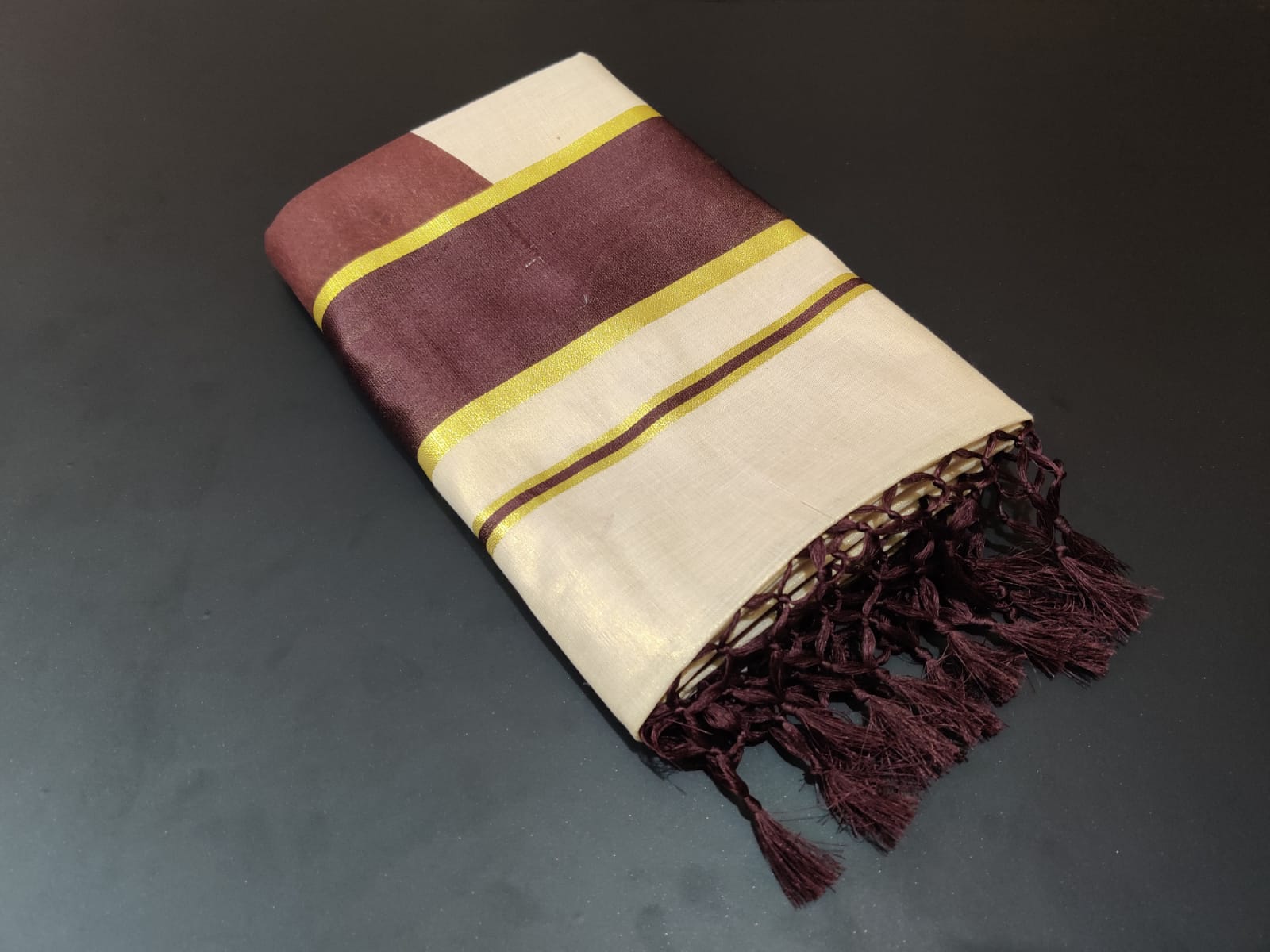 Be bold and beautiful in the SAMARA KB 2014 Kerala Saree! This stunning piece features a stylish brown and gold design for a standout look perfect for special occasions. Let its feminine charm bring out the best in you.